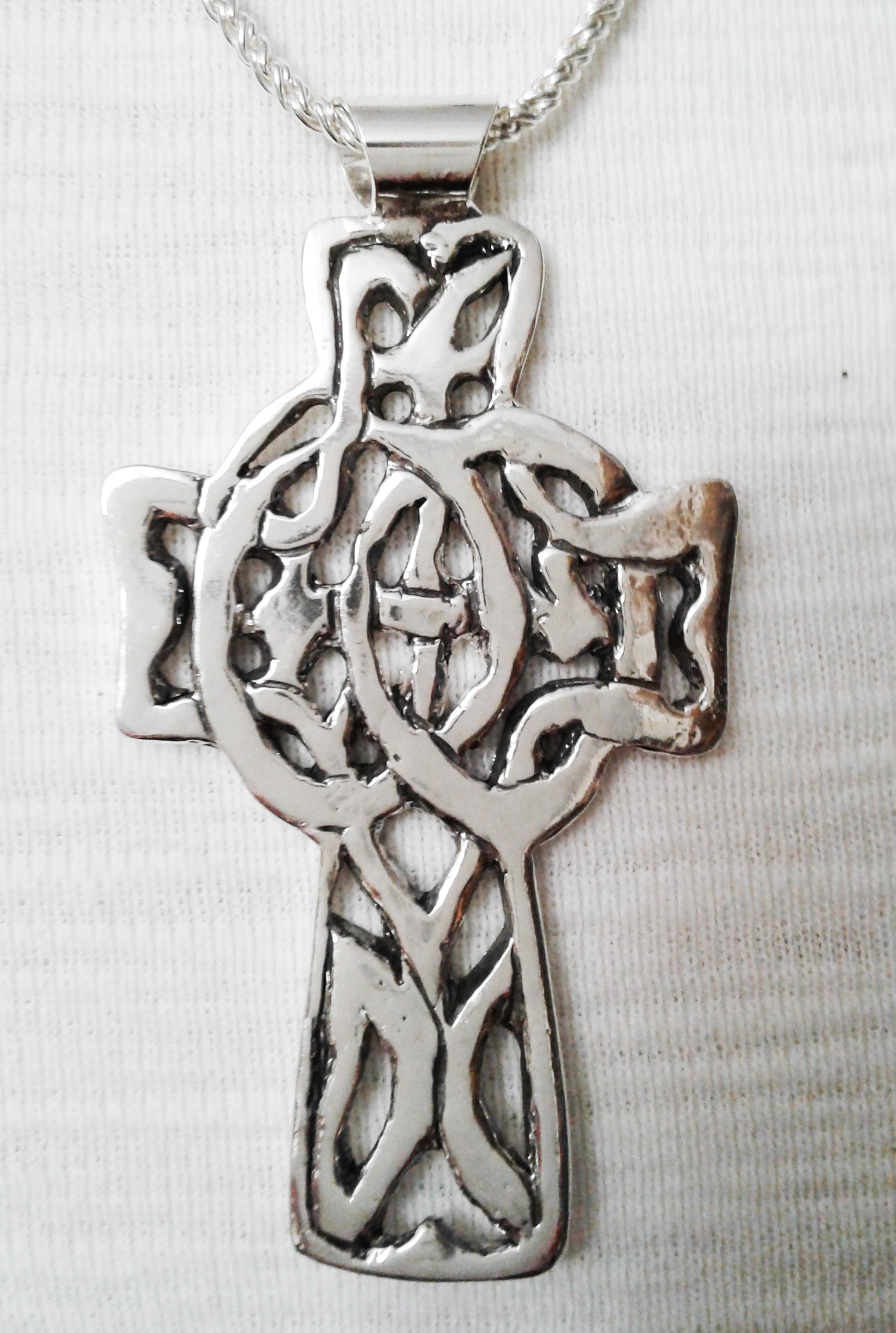 Based on the Celtic Designs, this Cross was originally carved from wax, then cast in Sterling Silver. The negative spaces have been removed for a lighter weight. It measures 2.5″ (including Bale) by 1.35″ and weighs over 2/3 troy ounce, without a chain. The weight is comforting with its smooth edges, flowing design and a visual connection to the Past. The Celtic Cross (Open Weave) is sold without a chain to allow for individuals to customize it for their own comfort. We have a small inventory in stock, ready to ship within two days. To order three or more, please contact us for special pricing.