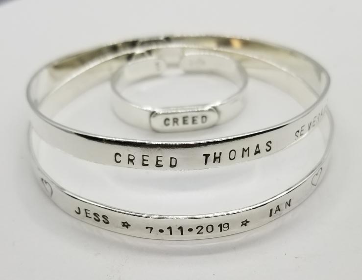 Three individual Sterling Silver Baby Cuff Set – one Baby Cuff, one Baby Name Cuff for Mom, one Wedding Cuff or Grandmother Cuff. Standard 8 letter Baby cuff with two Adult Cuffs., up to 20 letters each Adult Cuff. Gift Boxed Please allow 3 weeks for shipment from Order Date. Please provide details in NOTES section of PayPal Form.