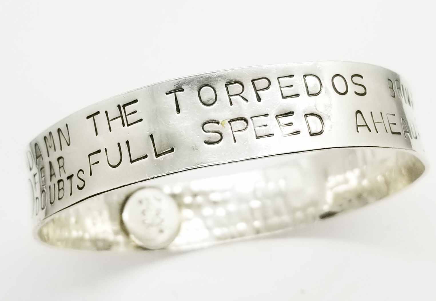Sterling Silver 18 gauge .5″ wide bracelet that is hand stamped with your own personal sayings, mottos, creeds, quotes or important messages you wish to have stamped. The bracelet begins as a straight strip of Sterling Silver which is calculated to slip over your hand without latches to snare on clothes or scratch skin. Prices are calculated based on Silver length and number of characters to be stamped. Your characters will be laid out on paper prior to stamping on Silver, with your Approval Required. Size and Style of Fonts used for stamping will be at the discretion of the Artist to best fit onto your bracelet. $250 DEPOSIT REQUIRED BELOW, INCLUDES UP TO 100 CHARACTERS. ADDITIONAL PAYMENT REQUIRED IF EXCESSIVE TEXT REQUESTED.