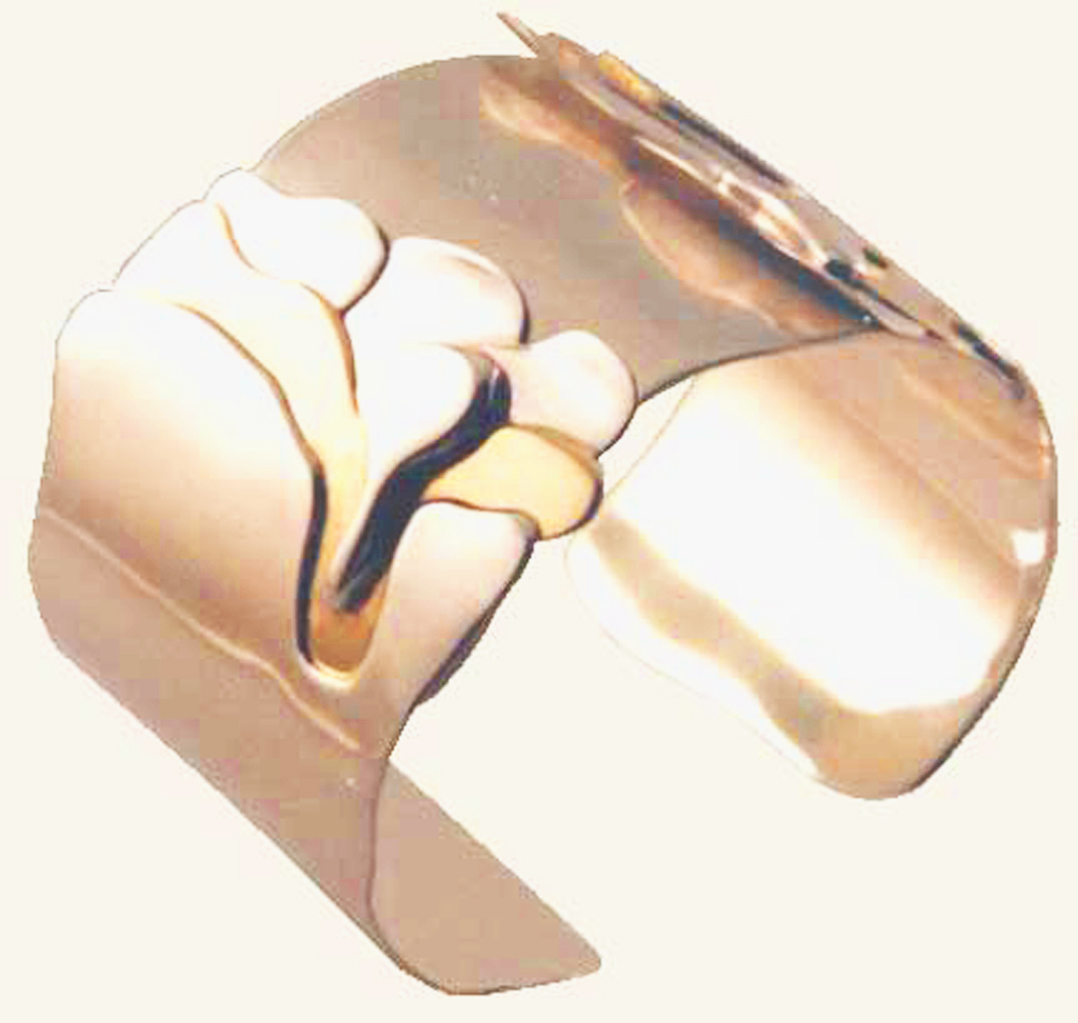 The Lily Pod bracelet is a Hinged Bracelet constructed in Sterling Silver Sheet and 14k Yellow Gold. It has no stones, but they may be added upon request. The Bracelet easily fits a 7″ wrist and may be custom made in other sizes. Every Bracelet will vary in detail, making each one a One of a Kind piece. Please allow 6 weeks for the Design and Creation of this One of a Kind Bracelet.