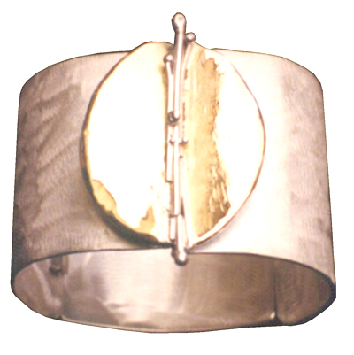 Hand Fabricated in Sterling Silver Sheet and 14k Yellow Gold, this Exclusive PRM Bracelet has stood the test of time for design, wearability and beauty. One of our All Time Favorites. Bracelet is 1.75″ wide and fabricated with four layers of Sterling Silver and Gold. Top is open, but may be customized with stones or other items of interest. Please allow 6 weeks for the Design and Creation of this One of a Kind Statement Bracelet.