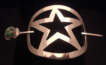 The Star is the Universal Symbol of GOOD and PROTECTION……..and Texas and the other things, too. The Star design holds all the hair in a neat place up and away from your face. Adjustable for different hair types and lengths. The Oval outline measures 2.5″ x 3.5″ with a Turquoise Tipped Sterling Holding Stick.