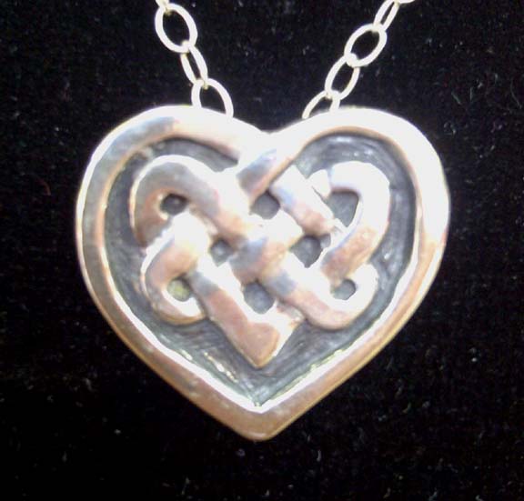 Heavy Sterling Silver Celtic Heart that was hand carved from a block of wax, then cast in lusterous Sterling Silver. The background has had a Patina applied so the Celtic design pops out and is easily seen. 18″ Cable Chain is the standard chain.