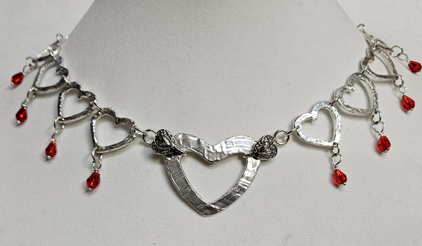 Seventeen 1″ Sterling Silver Open Hearts connected with Sterling Silver Jump Rings to form the Heart Chain for the large Sterling Silver Open Heart centerpiece. The Heart Chain has individual Red Crystal Briolette dangles. The Heart Chain opens in the front with small decorative Hearts. The overall length is 20″.
