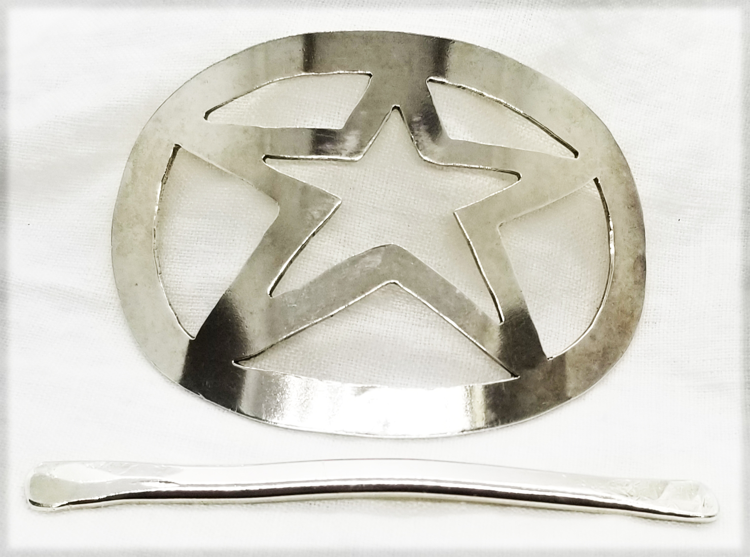 Hand Cut from Sterling Silver 16 gauge sheet, the Oval is only one piece – no soldering or piecing it together. The Silver Stick is from heavy wire that has been formed and hammered for added strenth and durability. Our Hair Holder is a safe and Hair Friendly way of holding your hair up and out of your face and out of the way while you are working. It will not break your hair like an elastic band and it will last forever. A very wise investment!!! Please allow 2 weeks from Order to Shipment. Other Hair Holder designs upon request.